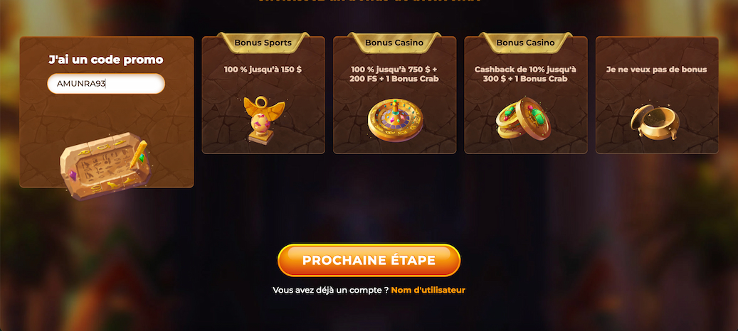 AmunRa est un casino en ligne à codes promos offrant des graphismes exceptionnels qui vous rappellent l’Égypte antique. L’inscription sur ce casino en ligne peut se faire avec un code promo ou non. Les nouveaux joueurs profitent d’un bonus de bienvenue de 100 % jusqu’à 500 € + 200 free spins + 1 bonus Crab, qui leur est accordé sur leur premier dépôt de 20 € minimum.