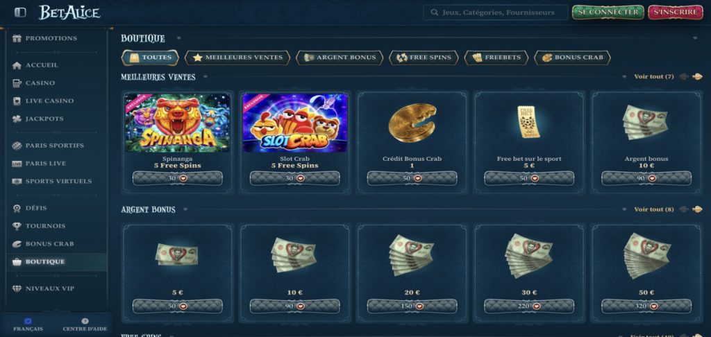 La boutique BetAlice est un lieu où vous pourrez dépenser tous vos jetons accumulés. Vous pourrez échanger vos jetons contre :