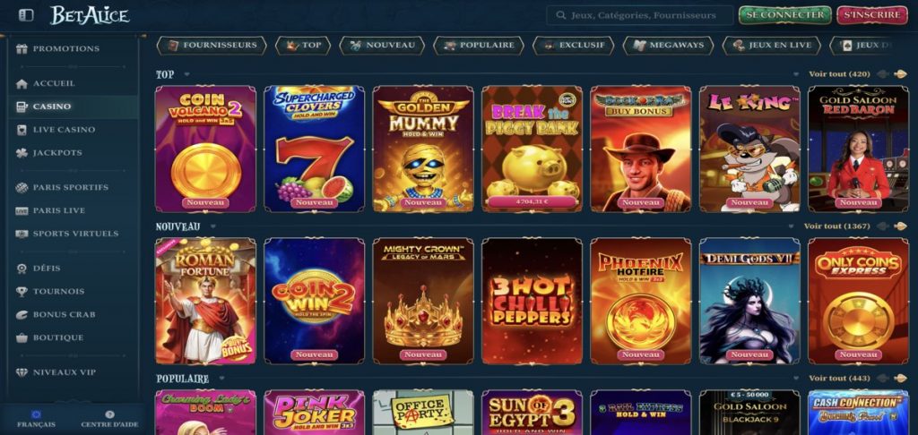 Le casino BetAlice héberge plus de 7000 machines à sous fournies par les meilleurs : Pragmatic Play, Play’n Go, NetEnt, Red Tiger. Il y a des :