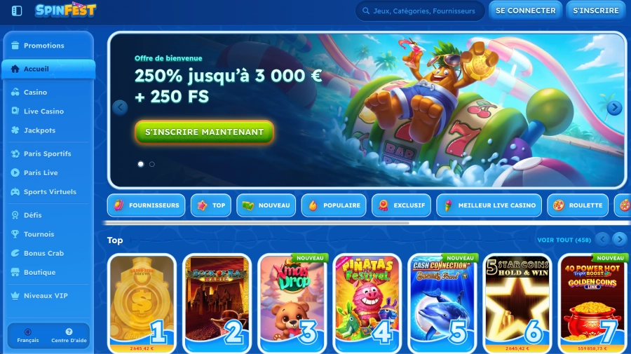 Le choix de titres ludiques sur Spinfest casino France est très vaste et bien organisé. La plateforme propose plus de 12 300 divertissements, issus de plus de 100 fournisseurs de logiciels. Explorez-y rapidement les slots, les cagnottes progressives, les classiques de table (cartes, dés) et un casino live. Les catégories sont simples, les jeux connus sont faciles à repérer, et il y en a pour tous les goûts des joueurs.