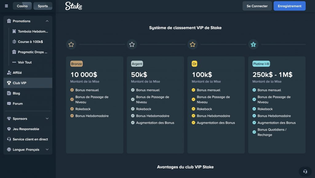 Stake casino FR dispose d’un programme VIP alléchant et accessible à tous ses clients. Aucun code promo n’est nécessaire pour y accéder.