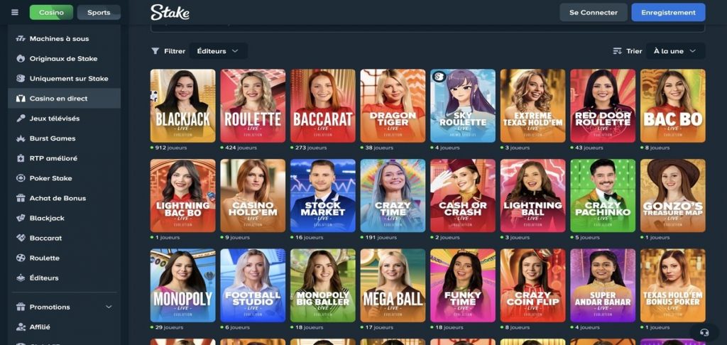 Les jeux de casino en live offrent en effet une expérience proche de celle d’un vrai casino physique. Ainsi, vous pourrez jouer à des jeux de blackjack en direct, craps en direct, jeux de poker en direct, Roulette en direct, Baccarat live et même à participer à des tournois de poker Stake. Parmi les plus populaires, il y a notamment Crazy Time, Mega Ball, Deal or No Deal, Balloon Race, Monopoly Live, Sweet Bonanza Candyland, etc.