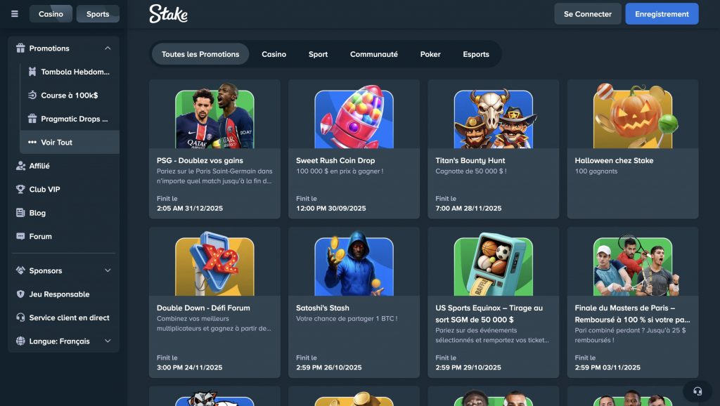Le casino organise régulièrement des défis communautaires et temporaires chaque semaine, voire chaque mois. Ceux-ci sont réservés aux joueurs actifs. Ces compétitions permettent de gagner des bonus, des Stake casino tours gratuits et même des récompenses en argent réel.